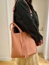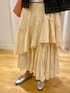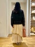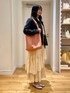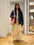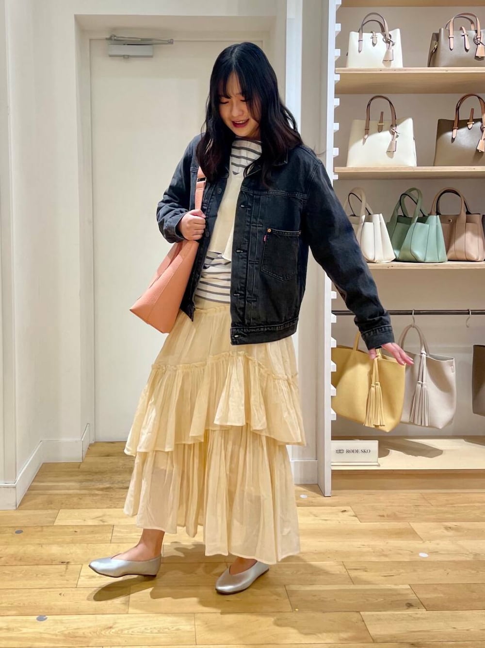 ランダムティアードスカートを主役にしたコーディネートです🍑🩰 写真ではイエローがかったように見えますが、実際はもっとコーラルピンク寄りのお色味になっています🧐169cmでくるぶしが見えるくらいの丈、裏地あり、ウエストはゴム仕様です。 ミドルインレイVネックプルオーバーは、レイヤードを楽しむのにぴったりの一着です!ショート丈を活かして、ボーダーをのぞかせてみました。