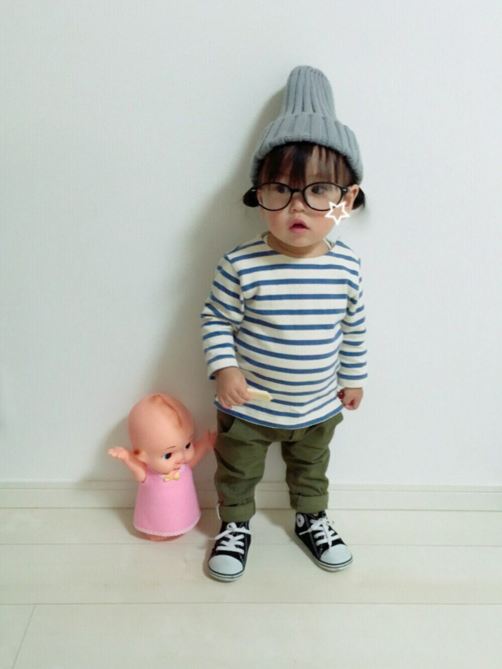 きょとん顏。 rinkaちゃんが前にしてたツインお団子にニット帽&メガネがすごく可愛くて思わず真似っこ☺︎♡ でも娘の場合、前髪が長くてとても残念な感じに…笑 ママちゃん、勝手に載せてごめんね😭 そして… バタバタでなかなかみなさんの所に遊びに行けずごめんなさい🙏💦 いつも見て下さりありがとうございます♡