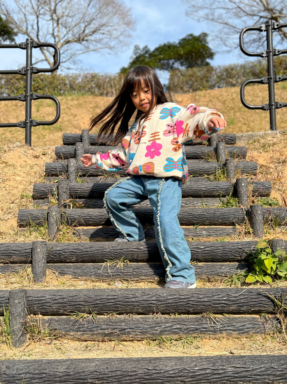 天気はいいけど少しだけ寒い日🫠 裏起毛で上着要らずないろちゃと ダウンまで着込んで走ってたパパ👨笑 breezeの総柄スウェット 店頭で見かけて一目惚れして 姉妹分買いました🤣🤣 デニムもセンターにフリンジ付いてるのめっちゃ好き🥺❤️