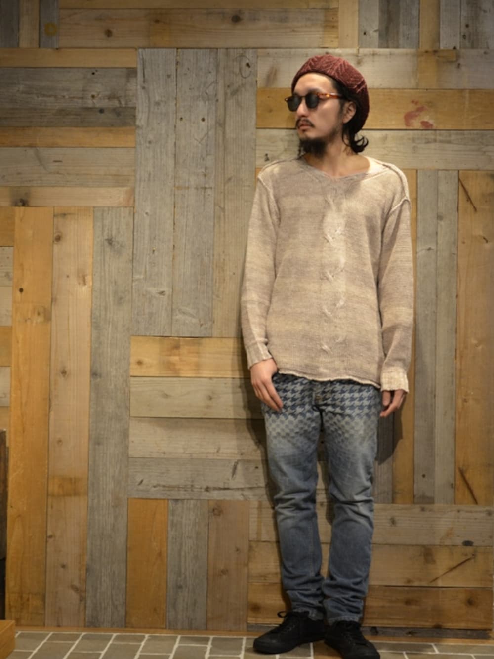 Iroquois/イロコイのニット/セーター「リネンロービング×カスリツイニング Vネック」を使ったコーディネート