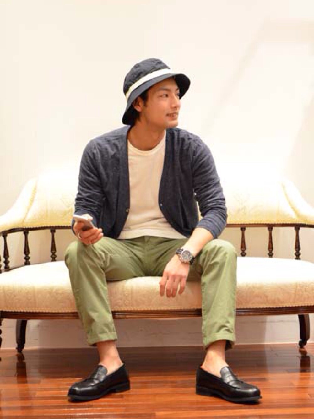 HAT : ARPENTEUR CARDIGAN : BANDOL T-SHIRT : FIL MELANGE PANTS : GROWN&SEWN SHOES : PARABOOT