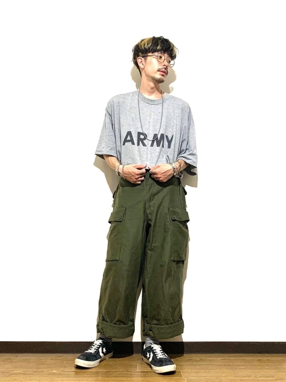 ミリタリースタイルは タックインとロールアップで すっきりとさせる。