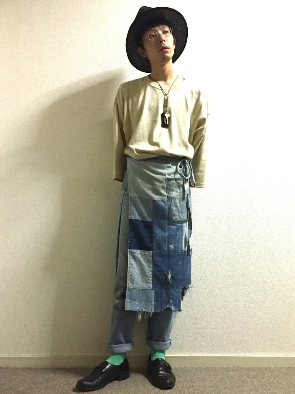 デニムのエプロンをズタボロに。 中々味が出て更に良くなった気がする! デニムエプロンにジーンズを合わせ デニム×デニム。 ビックTシャツで緩さもプラス。