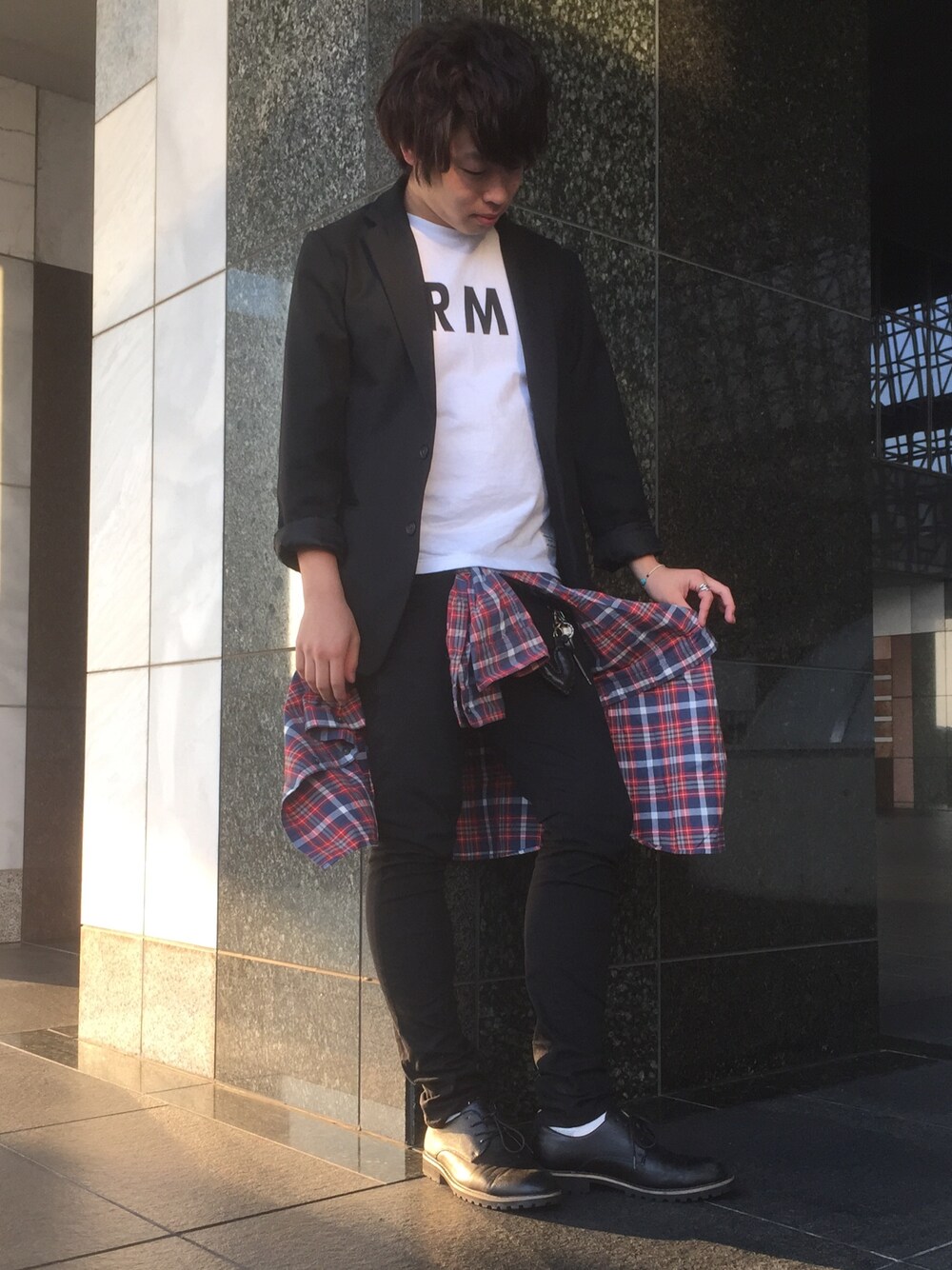 ブラック系のテーラードジャケット、ブラック系のその他パンツを着用したメンズの秋コーディネートの1枚目の写真