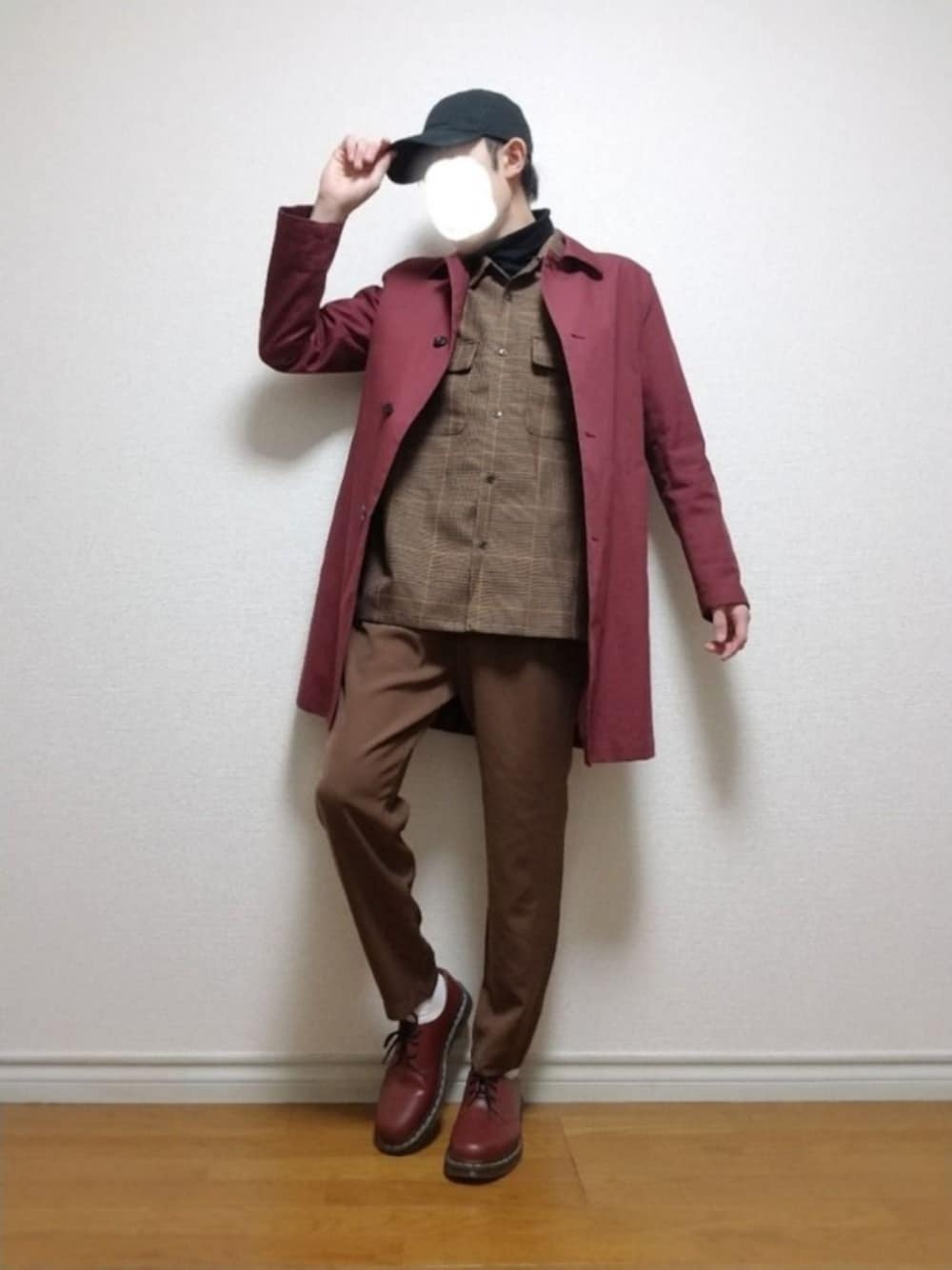 こんばんは🌃 昨日も多くの方々が見てくださり本当にありがとうございます🙇♂️ 本日はステンカラーコートのコーデです! 色の組み合わせがガーナチョコレートみたいになりました😅 コートはabahouseのステンカラーコートです! 主役です。 今回はブラウン系のアイテムと合わせてみました! ベージュ、ブラウン等は大体なんでも合うのでボルドーと組み合わせを楽しんでみました! インナーはGUのオープンカラーシャツとユニクロのタートルネックです! コートとの相性が良いタートルネックです! 黒か白で迷いましたがいつも白なので黒を採用しました! オープンカラーシャツは柄枠です! このオープンカラーシャツは万能すぎて購入して本当に正解でした😊 パンツはブラウンのパンツです! スラックスに近い系統のパンツでワイドでもテーパードでもない普通のシルエットです! ブラウンパンツをほとんど持っていないので今年はこれに頼りそうです😅 靴は赤の革靴です! Dr.マーチンです! コートとの色合わせと綺麗めアイテムとして採用しました! 帽子は黒のキャップです! 綺麗めの外しとタートルネックとの色の統一で採用しました! 色合いはボルドー+ブラウン+モノトーンです! ブラウン、ボルドーでまとめてモノトーンは差し色で加えています! ここまで長文を読んで下さりありがとうございました🙋♂️