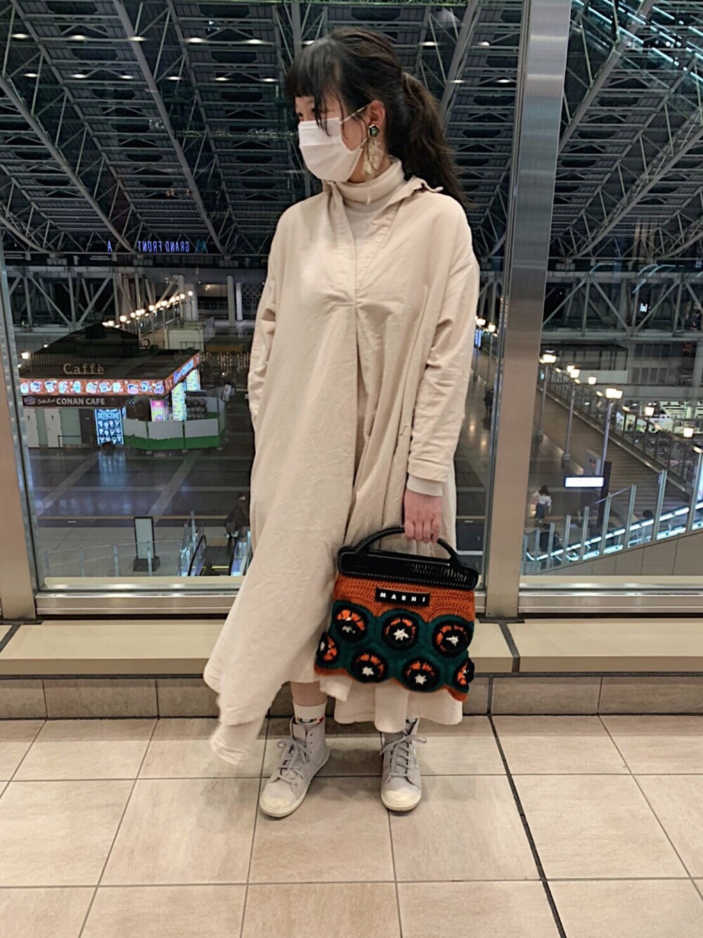 生地いっぱいワンピースだいすき お花のmarniのバックが主役🌼 裏主役はhappy socksのハート虹