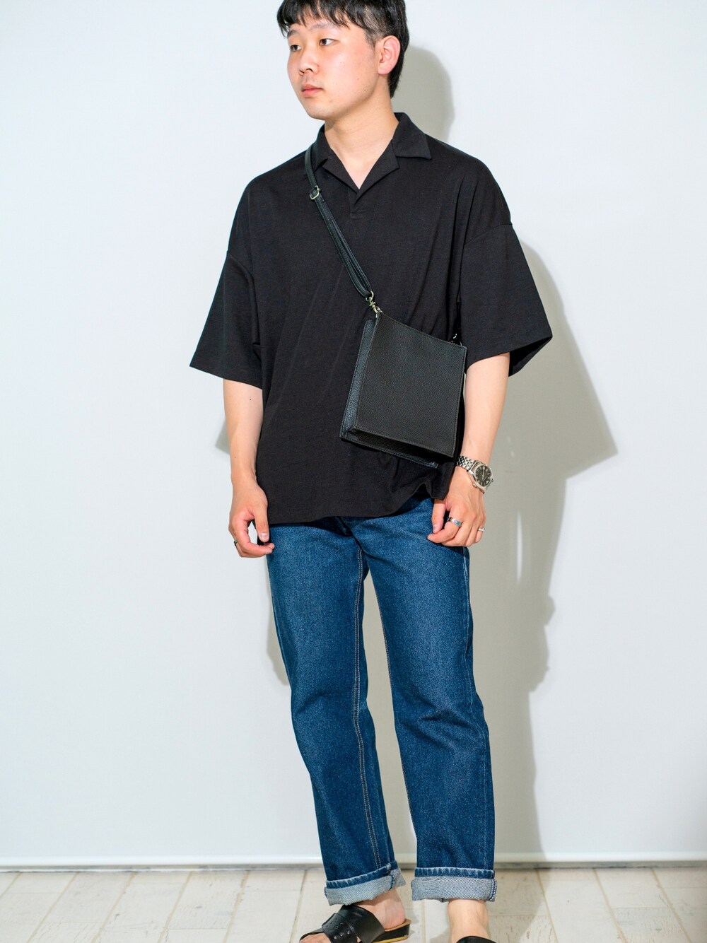 真夏の爽やかスポーツミックス⛳ 暑い💢もう何も着たくない←捕まる って人にオススメ、 ドライメッシュのトップスを使った快適大人カジュアルです! メッシュ素材が悪目立ちしないように、表面の凹凸が目立たない黒をチョイスしました。 さらに合わせたデニムにも一工夫。色の重力に逆らってトップスより明るい色のパンツを使うことで、コーデ全体の印象をトレンドアイテムのデニムに引っ張ってあげました! トーンの暗さで暑苦しく見えないように、足元はサンダルと高めのロールアップですっきりとまとめるのがよき💮