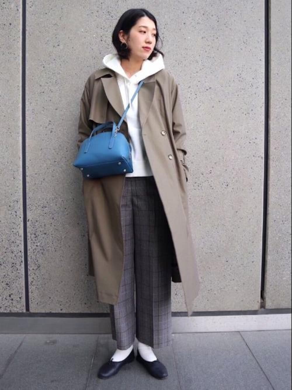 トレンチ×パーカーという定番コーディネートも、渋めのカーキカラーとブルーラインの入ったチェックで、きれいめな印象にまとめることができました。