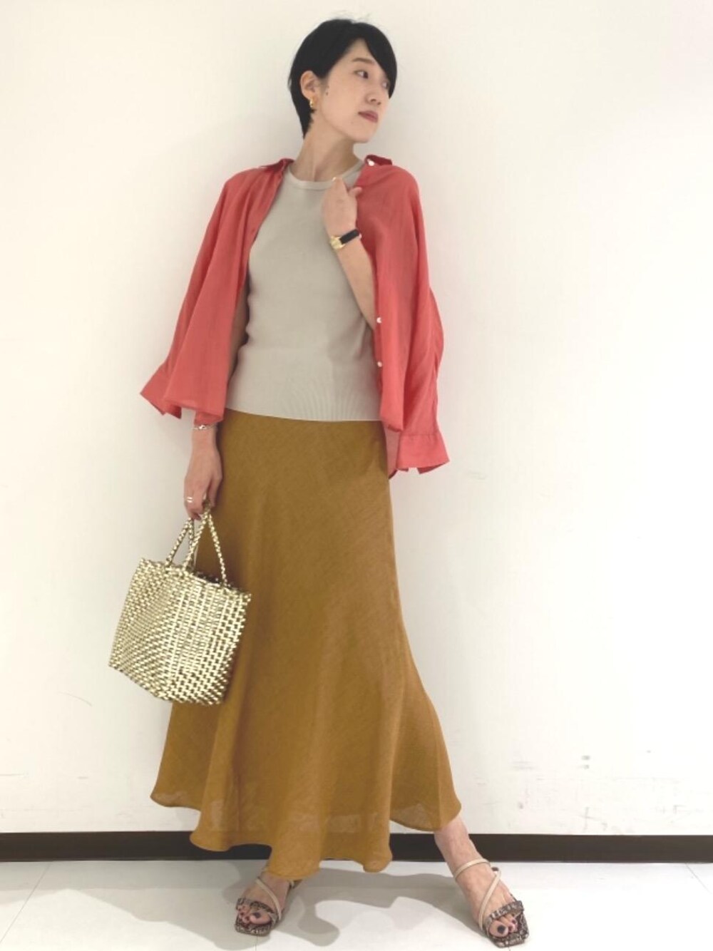 【身長:174cm】スカート(size:38)、シューズ(size:L)、その他(size:FREE) ベージュの組み合わせに差し色でピンクのシャツをコーディネート。普段、あまりカラーアイテムを着用しない方でも、小物感覚で取り入れやすくオススメです。