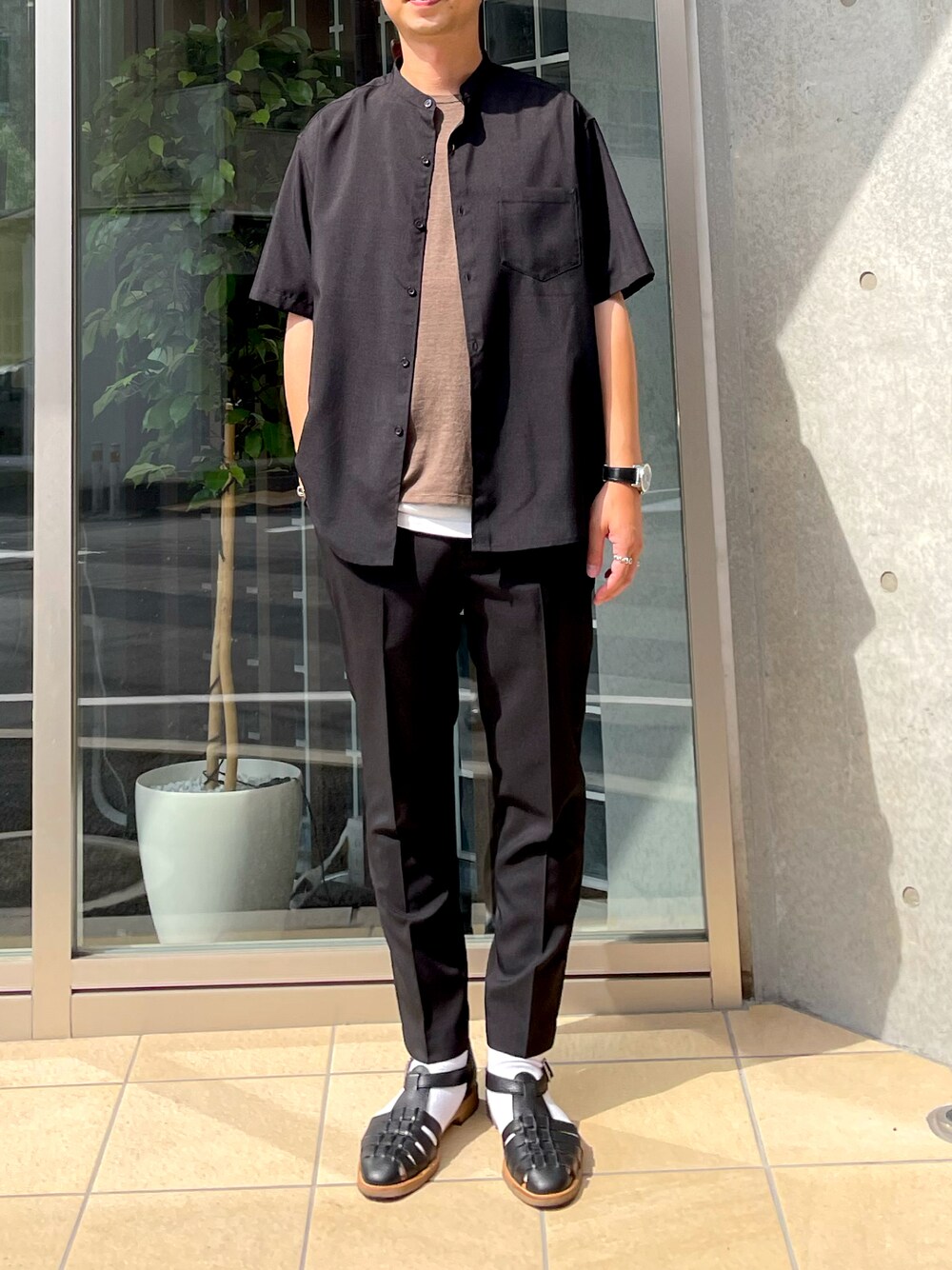 リライトバンドカラー&セミルーズパンツ 「リラックス」+「軽い着心地」にこだわったリライトシリーズのバンドカラーデザインシャツとセミルーズのセンタープレスパンツ。 ゆったりとしたシルエットで暑い夏にもおすすめです。 素材は薄手のポリエステル素材でサラッとしたドライな肌触りが特徴的。シワになりづらく接触冷感機能もあるのが嬉しいポイントです。 バンドカラーシャツはゆったりしており袖丈も長めでトレンドのサイズ感です。 パンツはややルーズなシルエットですがセンタープレスが入っているのできれいめに見えるイージーパンツです。