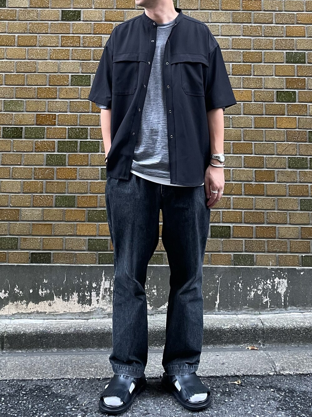 ブラック系のシャツ/ブラウスを着用したメンズの夏コーディネートの1枚目の写真