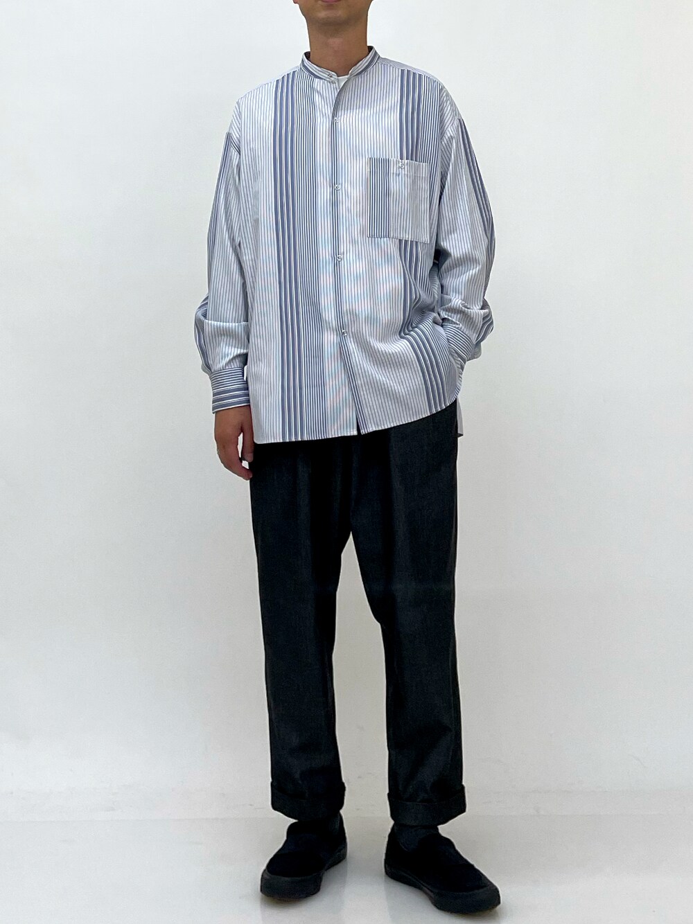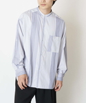 ランダムストライプバンドカラーシャツ ワイドシルエットで丈も長めのゆったりシャツ。薄手の素材なのでこれからの時期におすすめです。