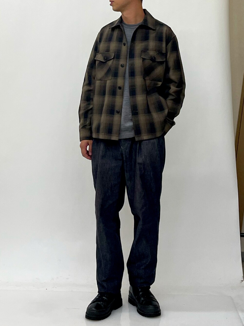 ishideのカバーオール「チェック柄CPOワイドジャケット」を使ったコーディネート