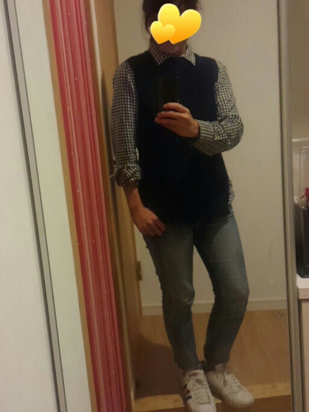 久々に投稿! こどもの体調不良でなかなか、更新できず…でした。 今日はユニクロのネイビーのベストを着けたい気分♥だったので、カットオフデニム(セルフカットです)に合わせて♪