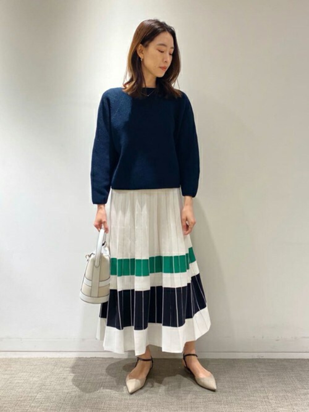 〈Ballsey〉レースアッププルオーバーを〈DES PRÉS〉のニットスカートと合わせました。 クリーンなホワイトが爽やかなスカートとネイビーのニットで、春のスタートにぴったりのスタイリングです。