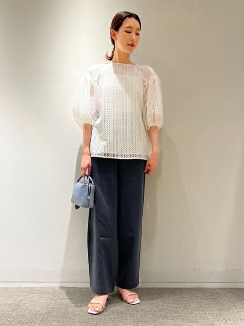 〈Ballsey〉スライトリーレースパフスリーブブラウスは透け感のあるレース素材。 ストレートシルエットのダークトーンのパンツを合わせ、ブラウスの甘さを抑えた大人の女性でも着用しやすいスタイリングに。