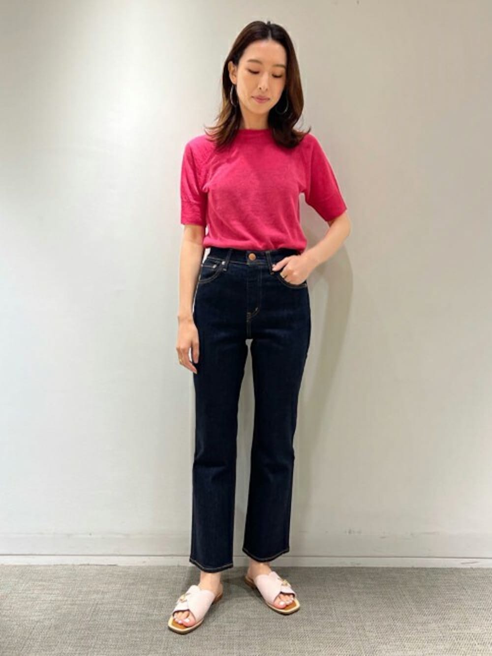 〈RED CARD〉完全別注の新作『FEEL』はフレアデニム。 フレア感も大袈裟ではなく、大人の女性も取り入れやすいシルエットです。 ハイウエストなので、トップスをタックインしてすっきりと合わせました。