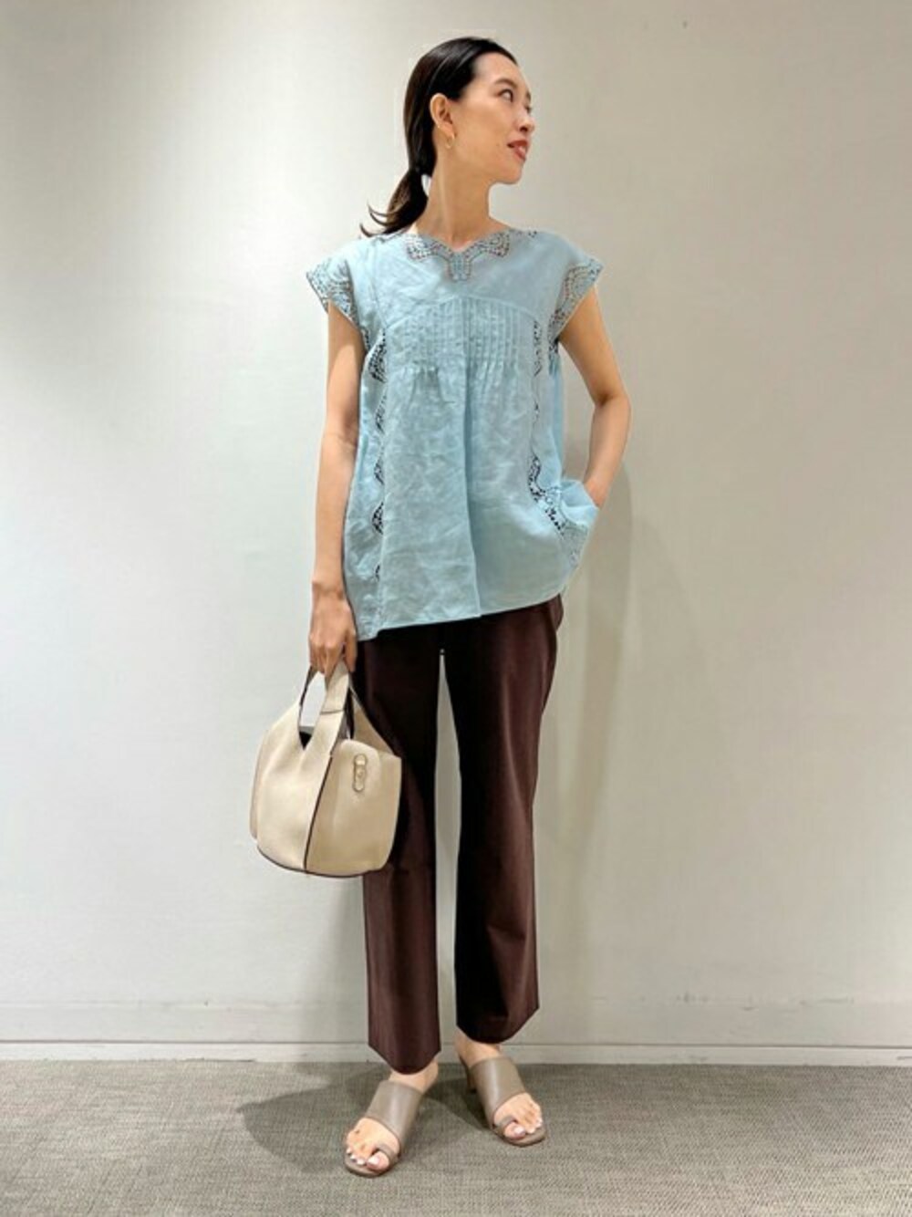 エンブロイダリーの透け感が涼しげな印象のブラウス。 ライトブルーはより爽やかに着用いただけます。 ホワイトやブラックのボトムスなども合いますが、ブラウン系もブルーと相性良くスタイリングできます。