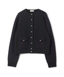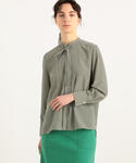 綺麗なライトグリーンのワンピースには、ブラックではなくグレーのパールカーディガンを合わせて優しい雰囲気に。 インナーには柄ブラウスを合わせることで、カーディガンを脱いでも華やかなスタイリングにしました。 オフィスシーンでもカジュアルになりすぎないワンピーススタイルです。
