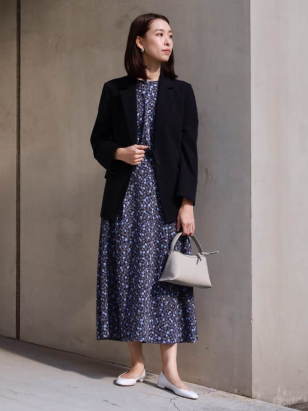 〈Ballsey〉のフラワープリントのワンピースは、柔らかな素材で着心地のよい1着。 袖は肩から二の腕にかけてしっかりとカバーしてくれるので、羽織ものなしでも着用しやすいです。 ジャケットを合わせれば、オフィススタイルにも対応できます。
