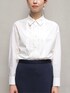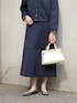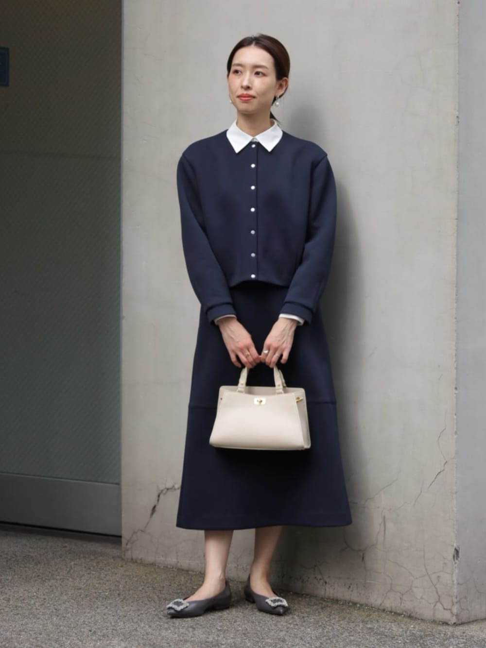 リップルダンボールシリーズを上下セットアップで着用したスタイリング。 上品な印象ですが、ジャージー素材でほどよくカジュアルで、軽く着用しやすいアイテムです。 インナーブラウスの襟を外に出してポイントに。 バッグやシューズは少しかっちりとしたものを合わせて全体を引き締めました。 商品詳細については使用アイテムをご確認ください。