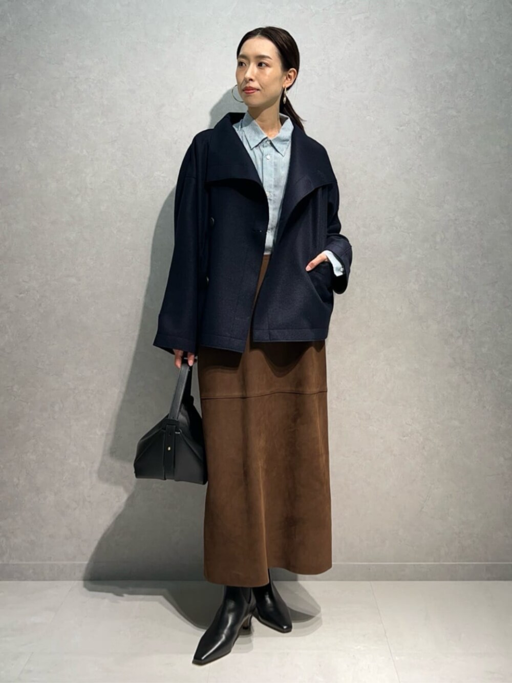 季節感のある素材の〈GALERIE VIE〉のスカートを着用したスタイリング。 スカートの形はタイトではなくAラインでスリットも入り足捌きもしやすいです。 コートは軽くさらっと着用できる1着。立体感のあるシルエットで、いつものお洋服に羽織るだけでこなれ感が演出できます。 シューズとバッグはブラックのレザーアイテムを合わせることで、カジュアルながらもシャープな印象にしました。 商品詳細については使用アイテムをご確認ください。