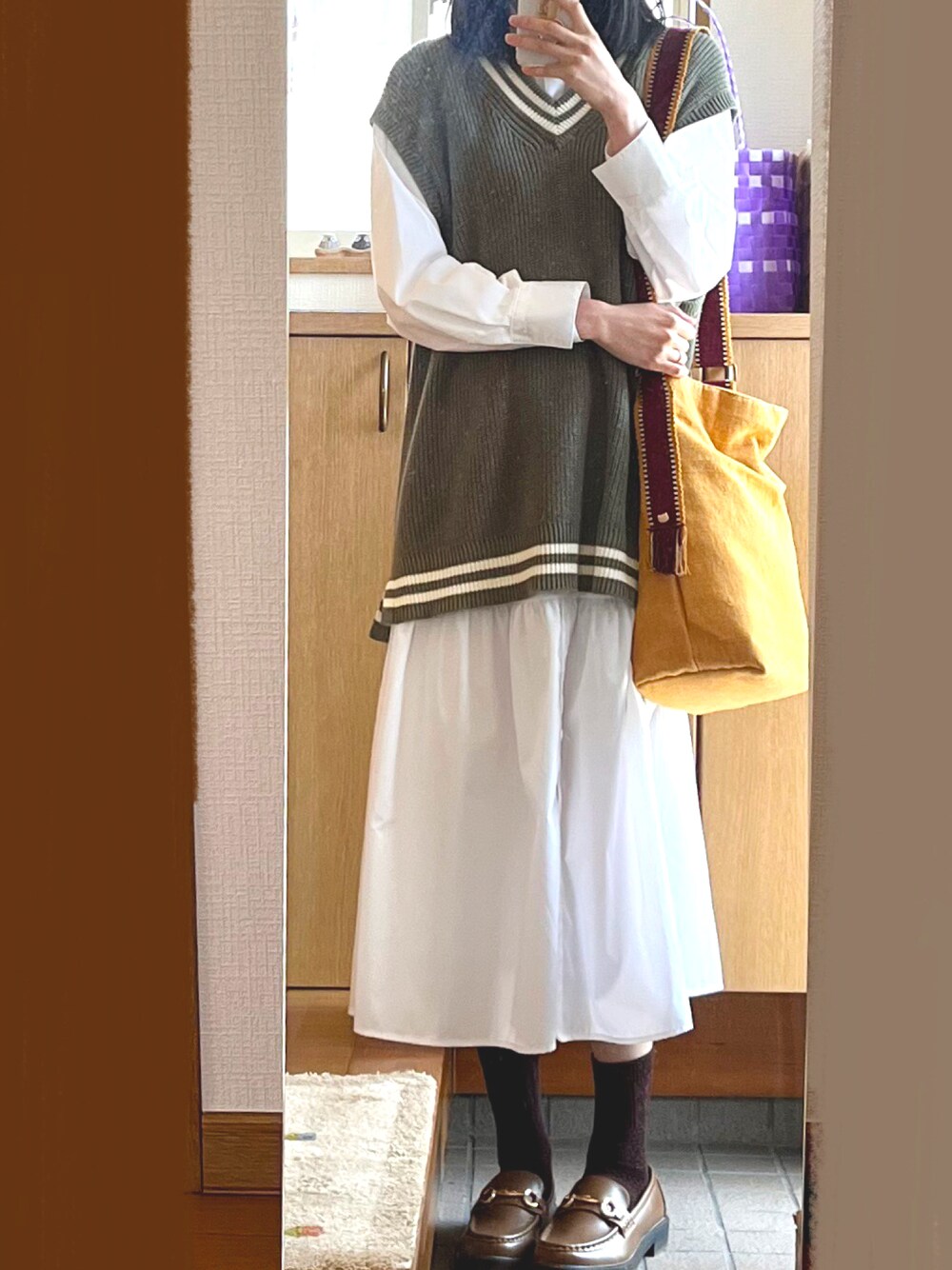 春らしい陽気になってきましたね。 シャツワンピースにニットベストを合わせたシンプルな格好で出かけました。 peopletreeのバッグのマスタードカラーをアクセントに。