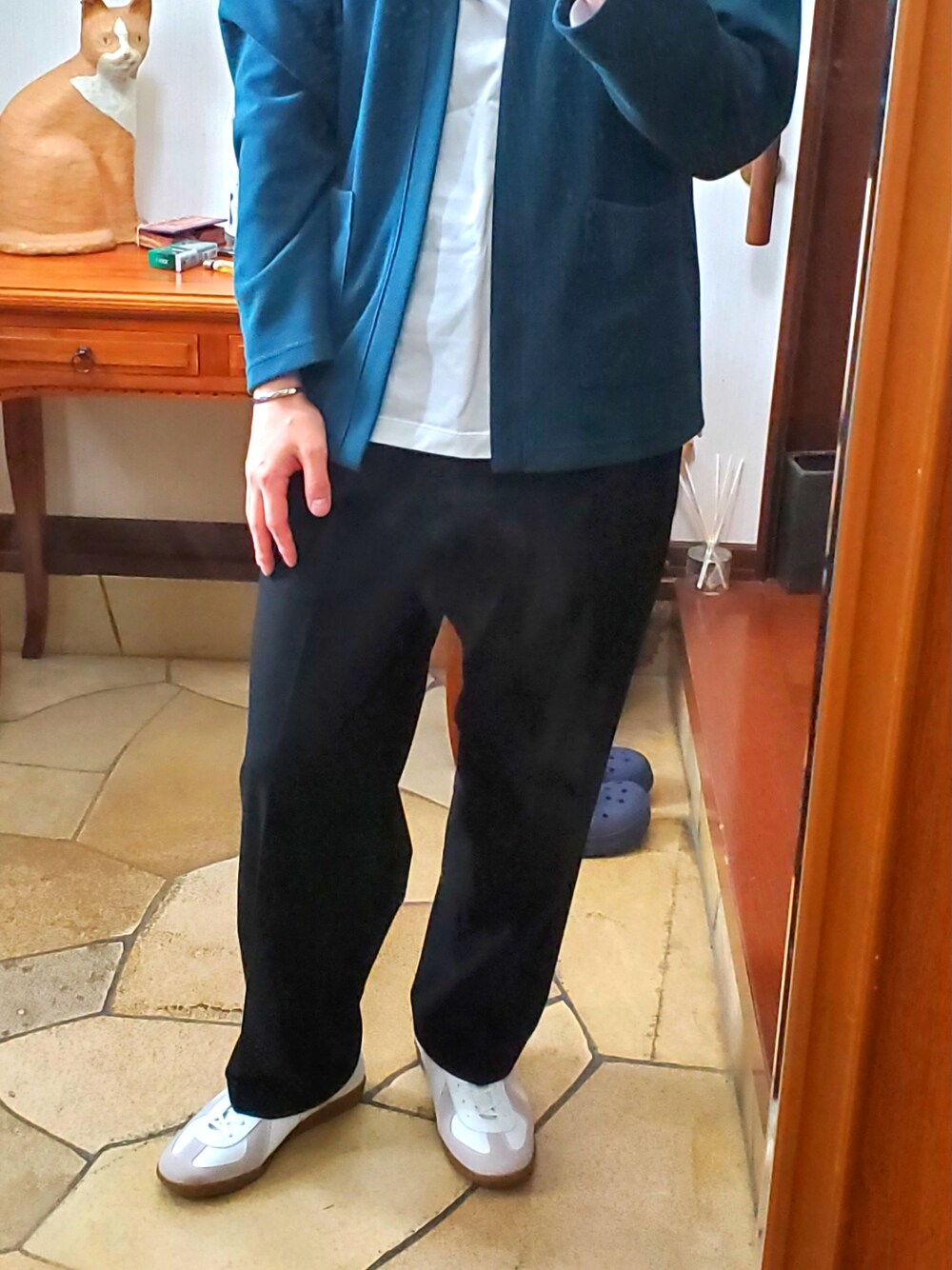 カーディガンと黒スラックスでキレイめコーデ。足元はジャーマントレーナーで外してみました😊ちょっと癖のある白スニーカー大好きです(*´∇`*)