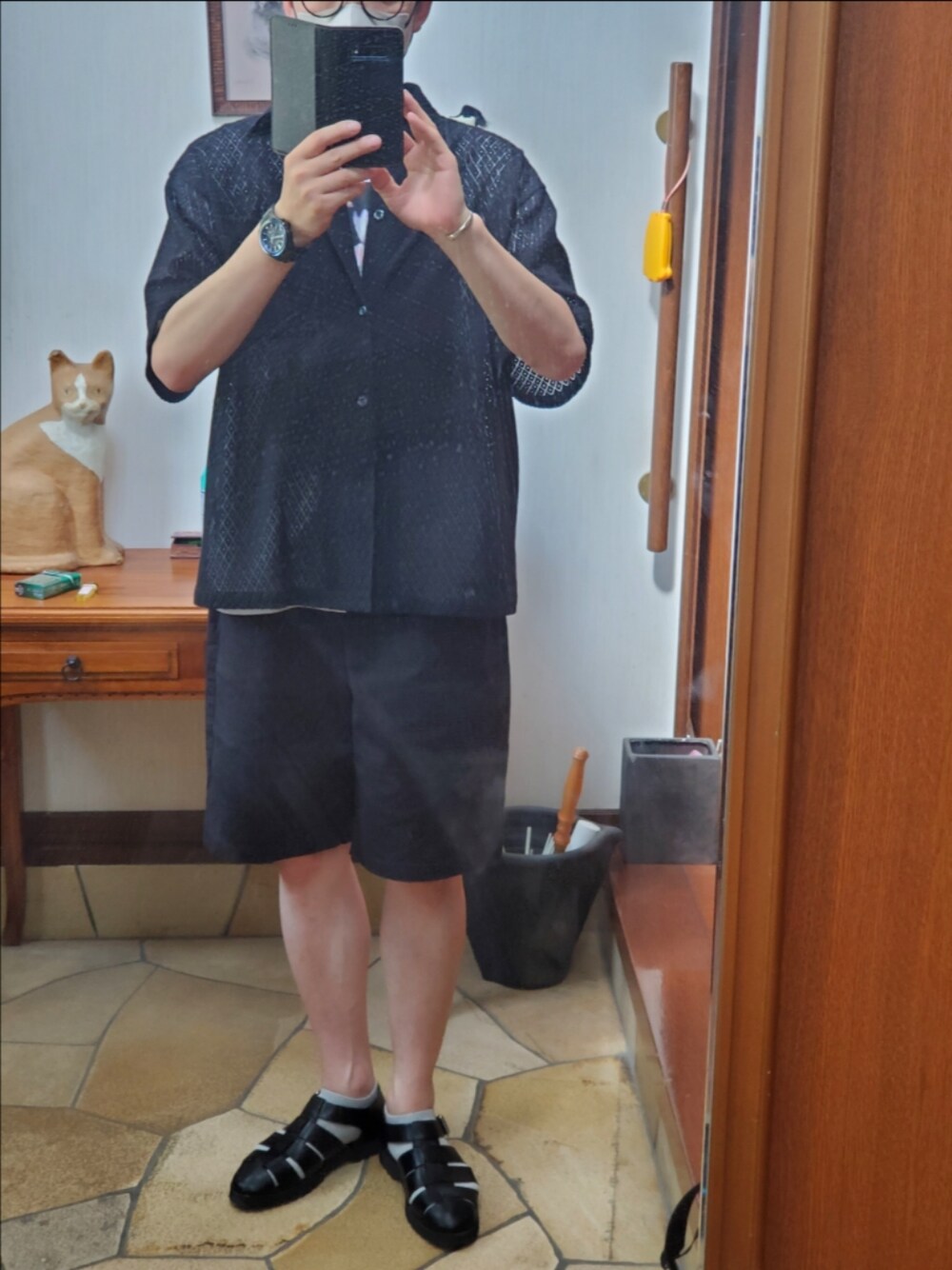 真夏のブラックコーデ(*´∇`*) レースシャツとショートパンツとサンダルで涼しげに!全部黒だけど素材が違うとのっぺりしなくていいですね(*´∇`*)