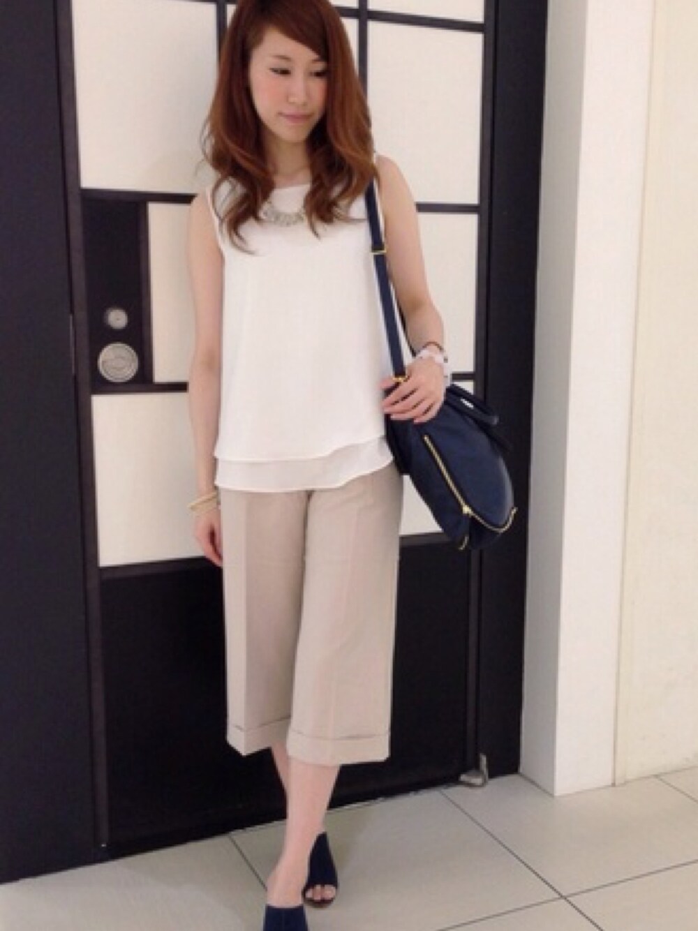 人気のジョーゼットブラウスです! やっぱりかわいいので着てしまいました♡ 白コーデにしたので、ネイビーでパキッと差し色に!