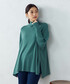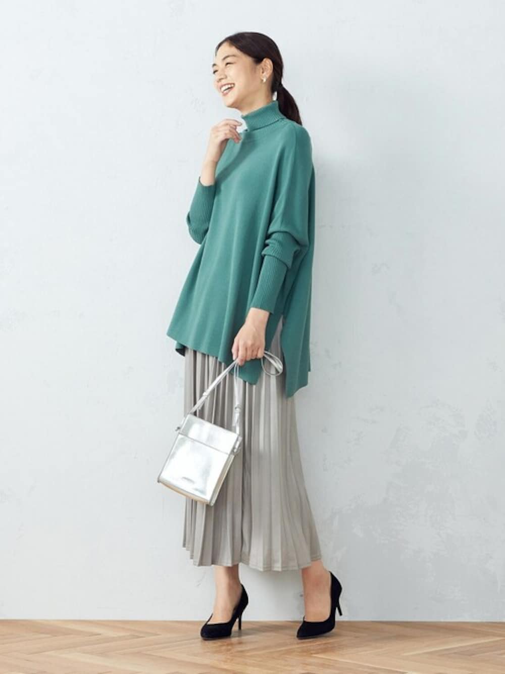 【コムサイズムレディース】 WEB限定色、グリーンのニットポンチョ。 ライトグレーやシルバーの小物で、 さらに上品見えして、コーディネートのアクセントに。