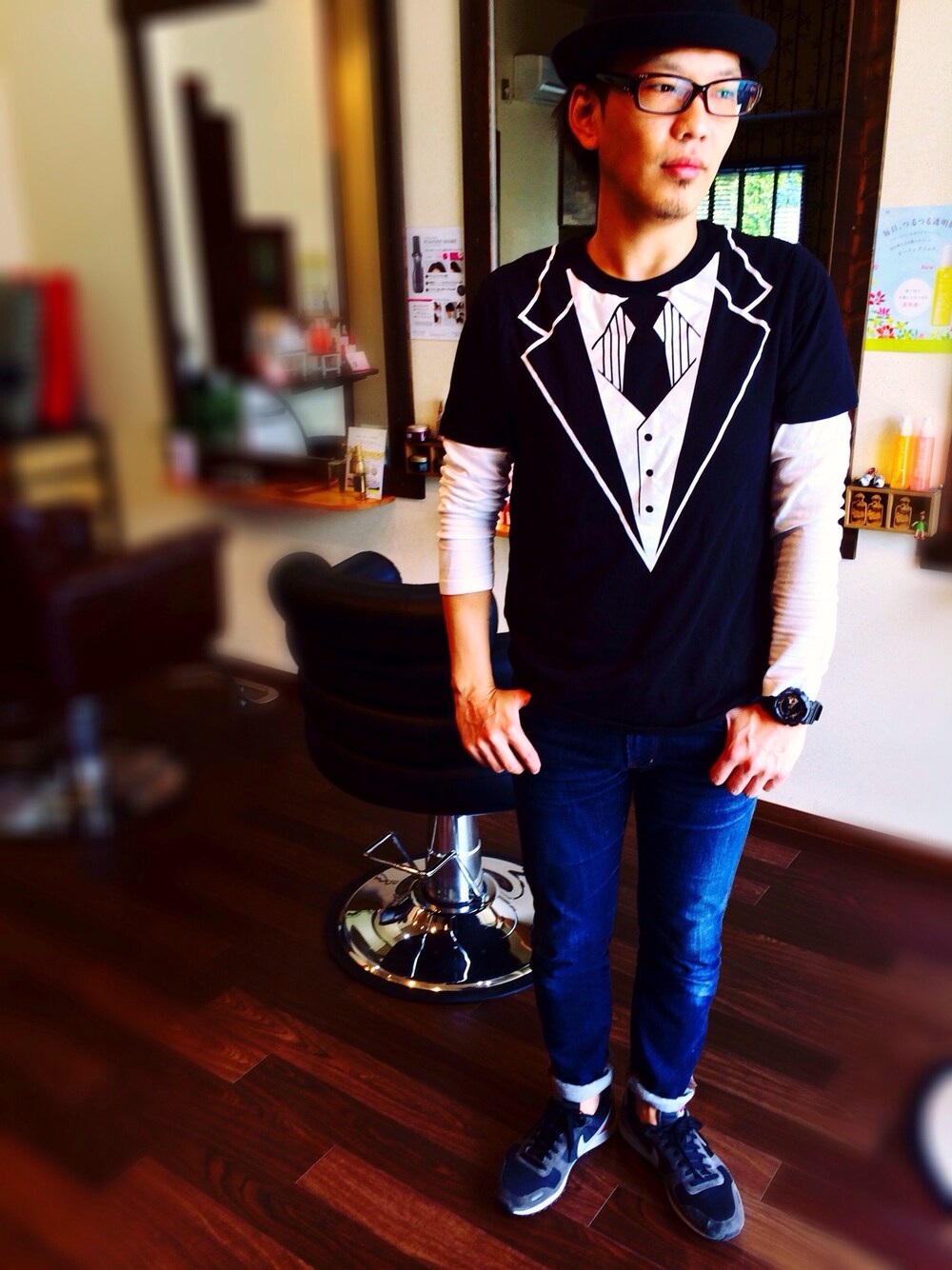 ブラック系のTシャツ/カットソーを着用したメンズの春コーディネートの1枚目の写真