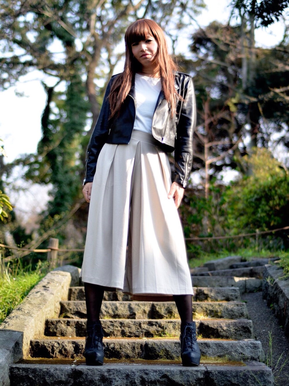 ユニクロのスカンツを初めて履きました。ライダースとの組み合わせは定番! ちなみに男です。 横浜元町散歩してました。