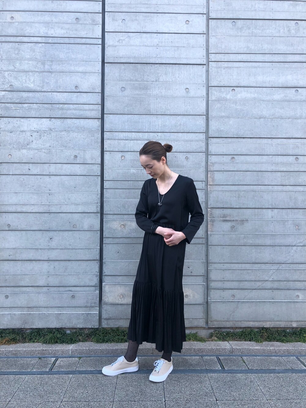 ワントーンコーデ✨ブラックワンピースにベージュのスニーカーを合わせて! シルバーラインのアクセサリーは必須アイテム✨