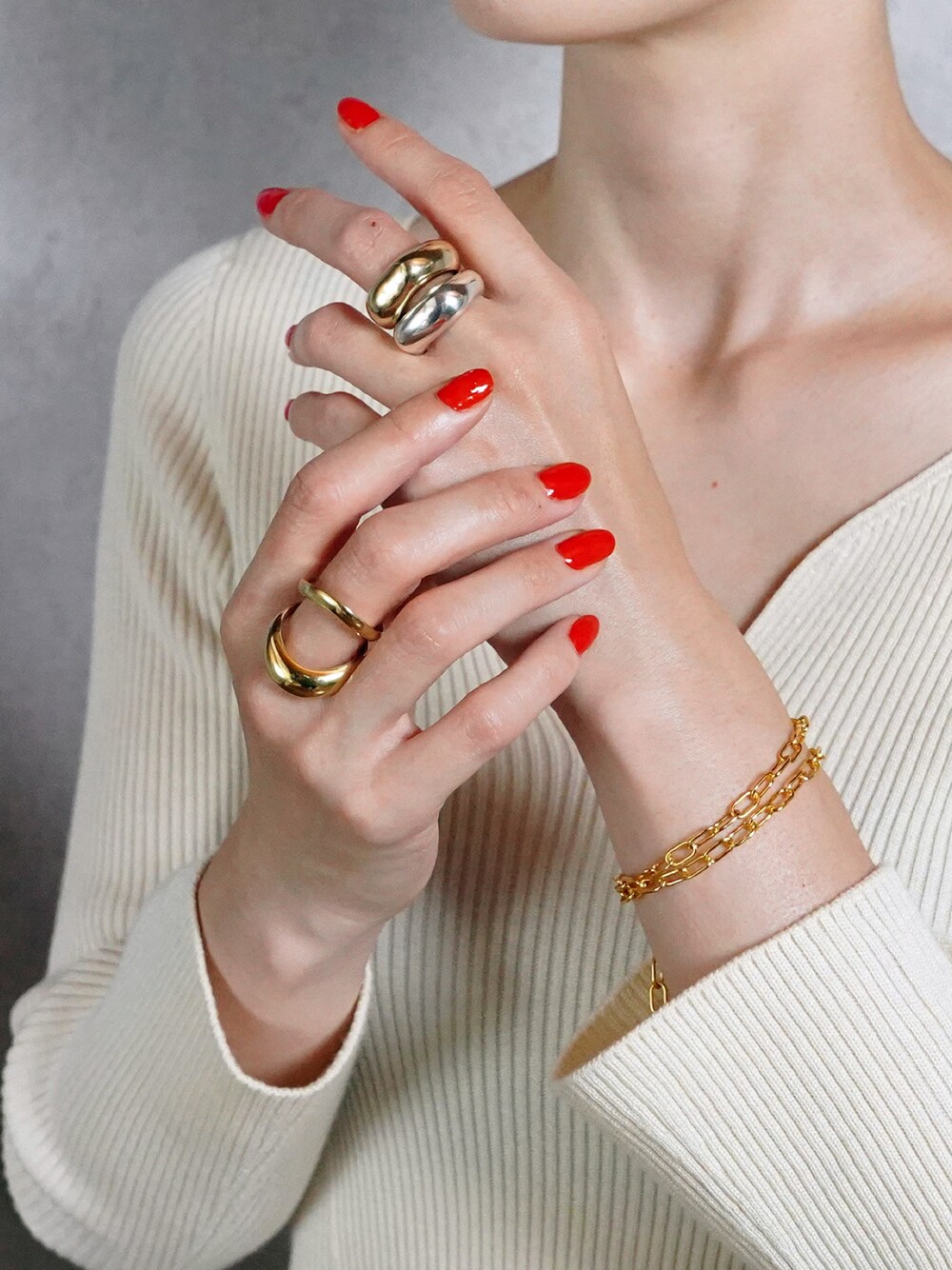 手元コーデ ホワイトニットにゴールドアクセ。 ボリュームあるリングが引き立ちます。 @isolation_jewelry