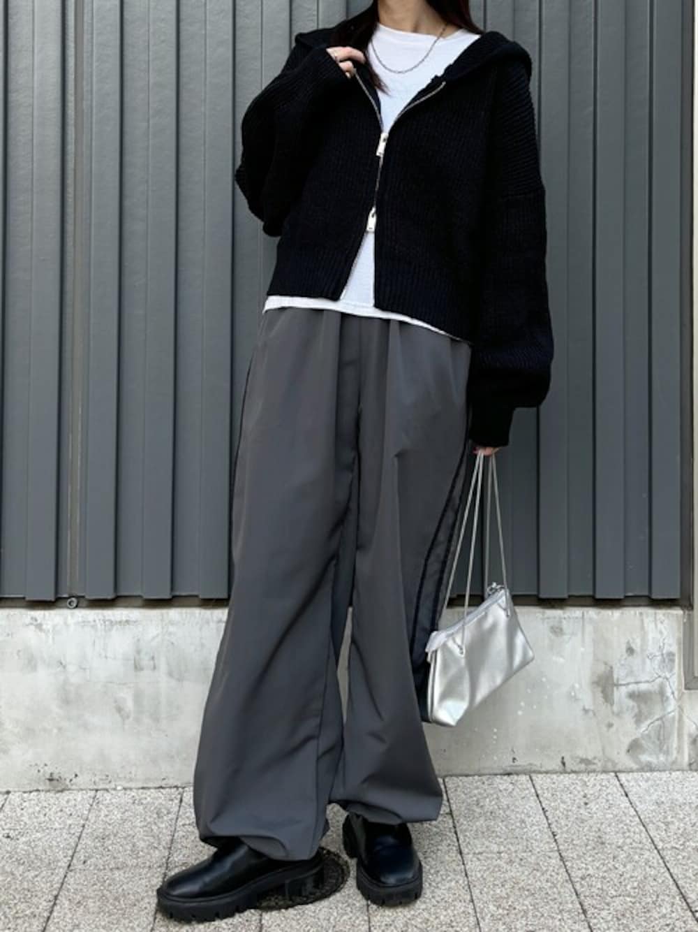 ISOOK(I-SOOK)のパーカー「【ISOOK / アイスー】ダブルジップニットパーカー / ショート丈 クロップド丈 春ニット フーディー セータージップアップ ブラック ネイビー グレー ZOZOTOWN限定」を使ったコーディネート
