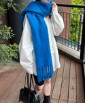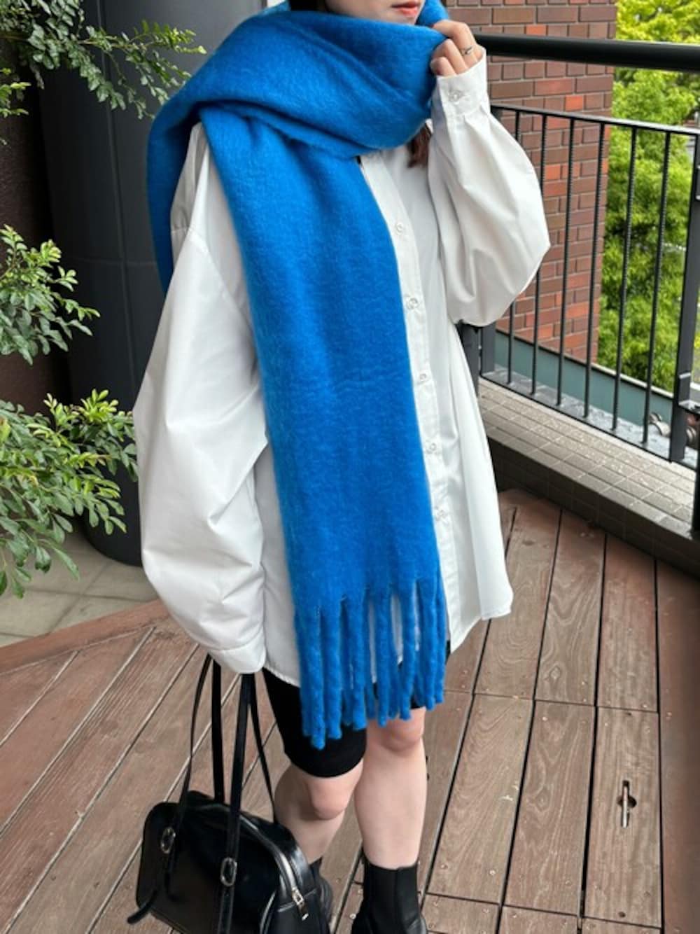 ISOOK(I-SOOK)のマフラー「【ISOOK / アイスー】ふわふわフリンジマフラー / ボリュームマフラー ストール 無地 チェック柄 レディース アイボリー チャコール ブルー ライトグレー イエロー ブラウン ZOZOTOWN限定」を使ったコーディネート