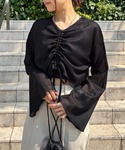 ISOOK(I-SOOK)のTシャツ/カットソー「【ISOOK / アイスー】フロントシャーリングフレアスリーブプルオーバー / 前後2way ドローコード 長袖 Vネック ボートネック 透かし編み シアートップス ラッセル クロップド丈 ショート丈 ボーダー 白 黒 ブラック ホワイト ZOZOTOWN限定」を使ったコーディネート