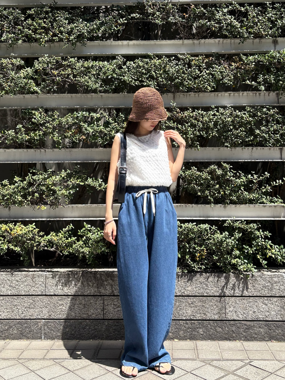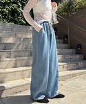 ISOOK(I-SOOK)のデニムパンツ「【ISOOK / アイスー】リラックスワイドデニム / イージーパンツ ビックシルエット カーブ バレル ウエストゴム ウエストギャザー ハイウエスト ドロスト 総ゴム インディゴブルー ライトブルー ブラック 黒 ZOZOTOWN限定」を使ったコーディネート