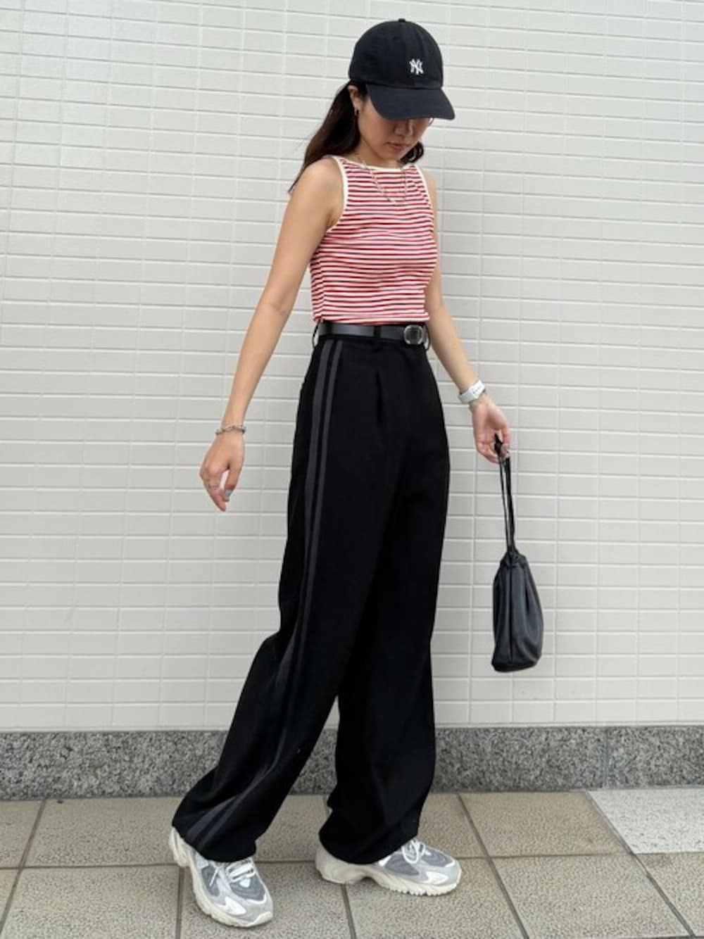 ISOOK(I-SOOK)のタンクトップ「【ISOOK / アイスー】ボートネックボーダータンクトップ / リブタンクトップ リンガー ノースリーブ ボートネック スラッシュドネック ミドル丈 細ボーダー レッド ブラック 赤 黒 ZOZOTOWN限定」を使ったコーディネート