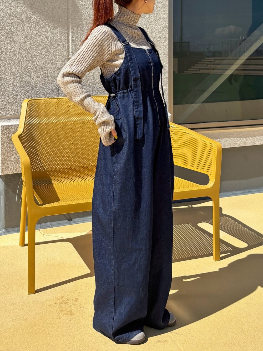 ISOOK(I-SOOK)のサロペット/オーバーオール「【ISOOK / アイスー】フロントジップサロペットパンツ / デニム サロペ オーバーオール ハーフジップ ドロスト ハイウエスト ロング フルレングス ブルー ブラック 青 黒 ZOZOTOWN限定」を使ったコーディネート