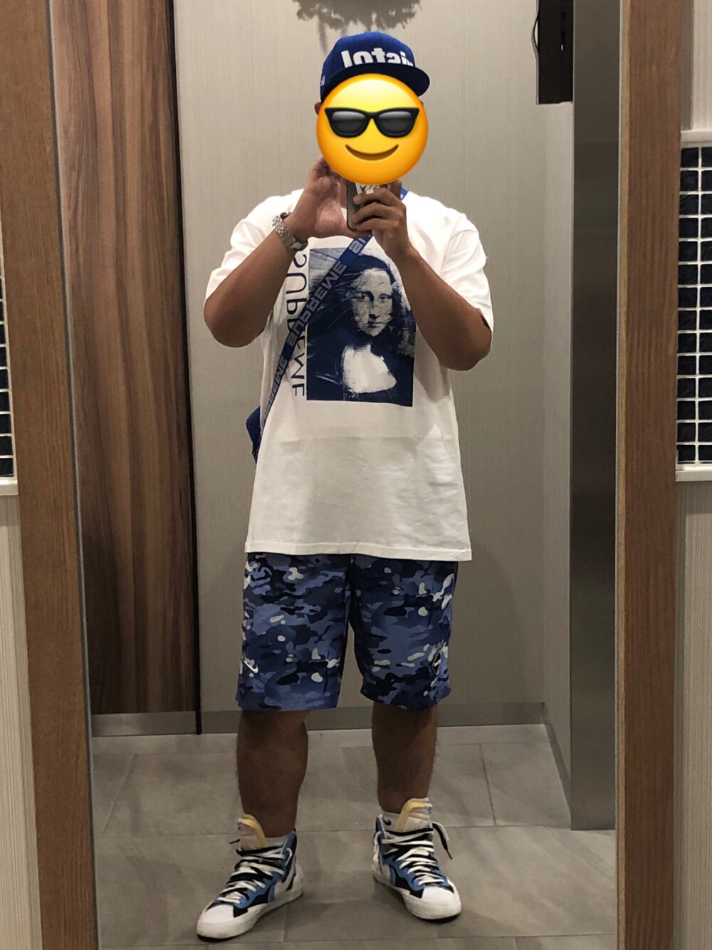 青系コーデ モナリザTかっこいい キャップ→fcrb×newera Tシャツ→supreme ショルダー→supreme パンツ→fcrb×NIKE スニーカー→NIKE × sacai