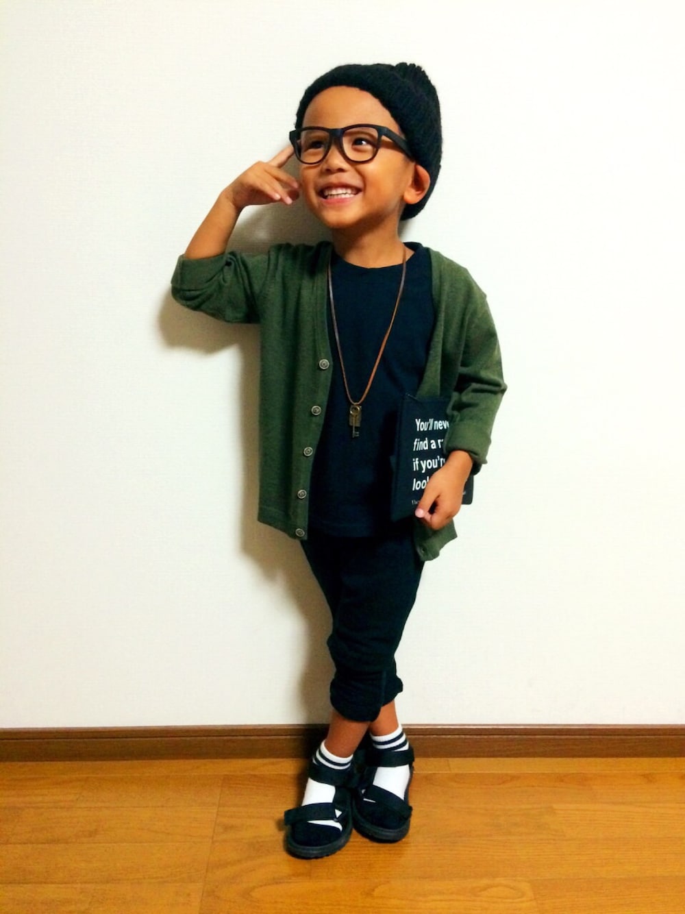グリーン系のカーディガン/ボレロ、ブラック系のその他パンツを着用したキッズの秋コーディネートの1枚目の写真