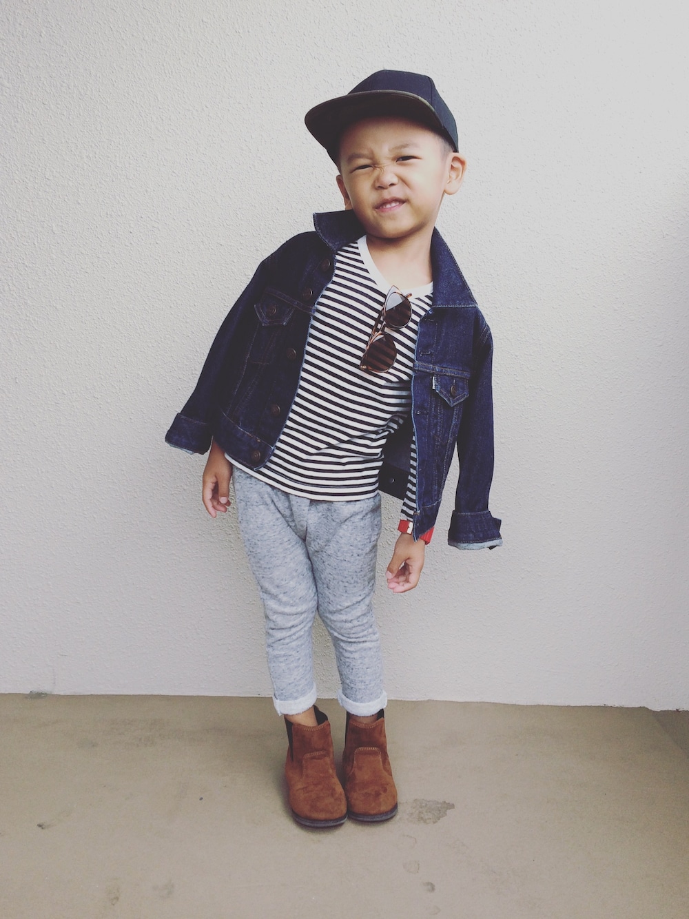 ブルー系のデニムジャケット、ブラック系のキャップを着用したキッズの秋コーディネートの1枚目の写真