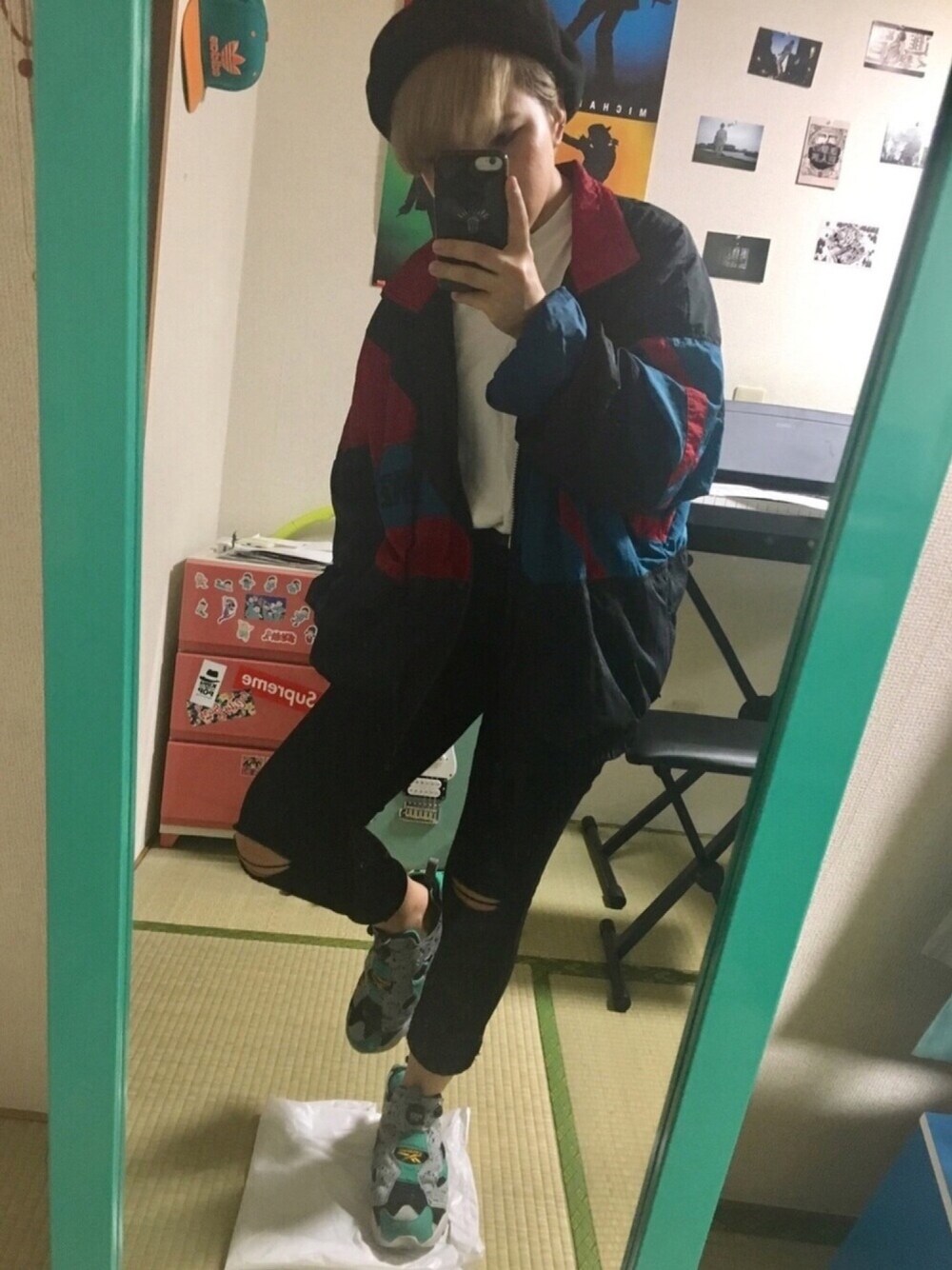 膝に穴あいてるんだせ☆ていうポーズ。本日も足元には袋w そいえば昨日のも穴あいてたな〜