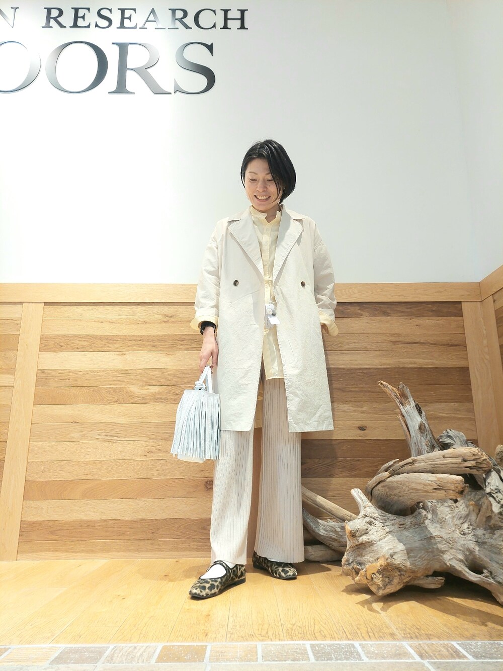 ワントーンぽいコーデ ニットパンツとシャツの組み合わせはかっちりし過ぎなくて好き