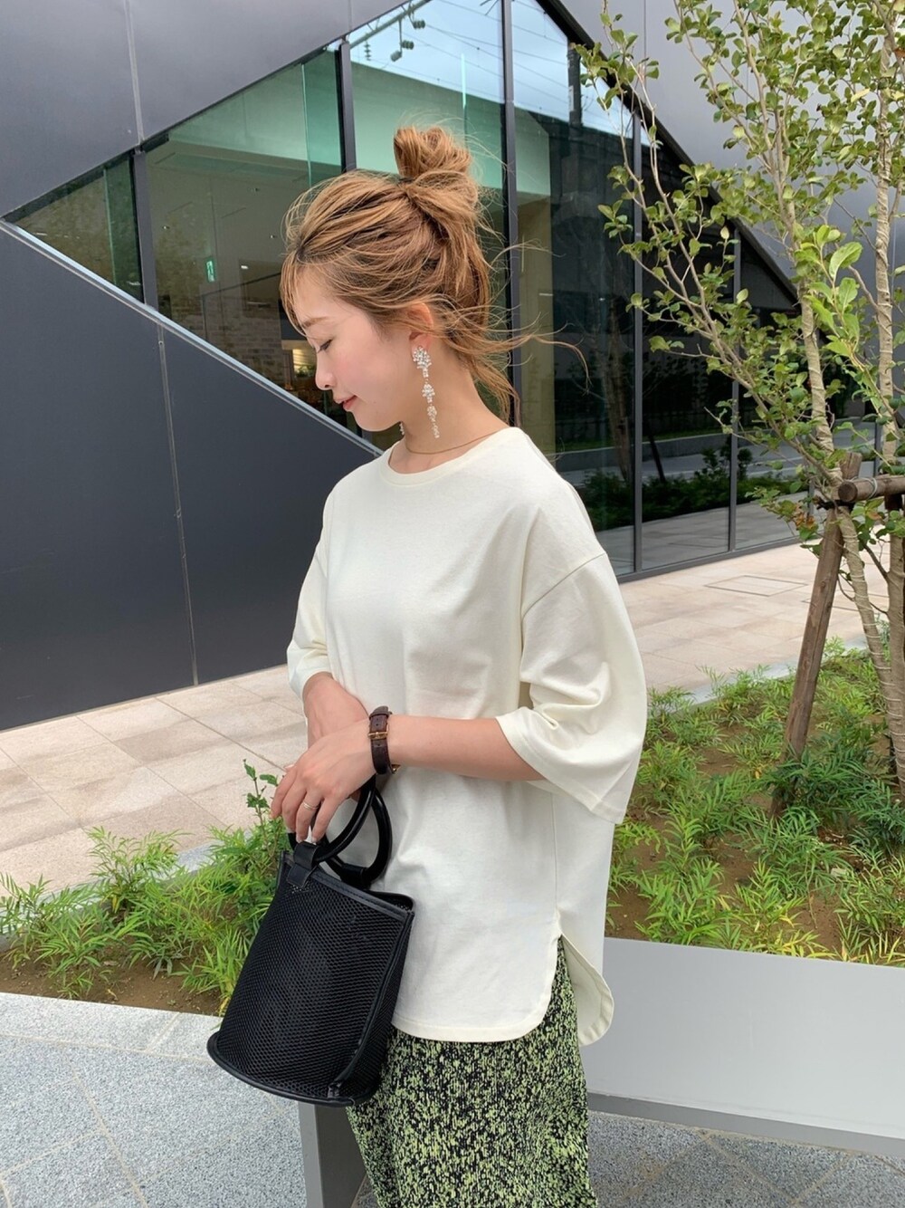 オーバーサイズのUSAコットンtee。 ゆったりしたサイズ感のtシャツと、 ゆるーいプリーツパンツで リラックススタイリング。 ラフな着こなしの時は、アップヘアが好き!