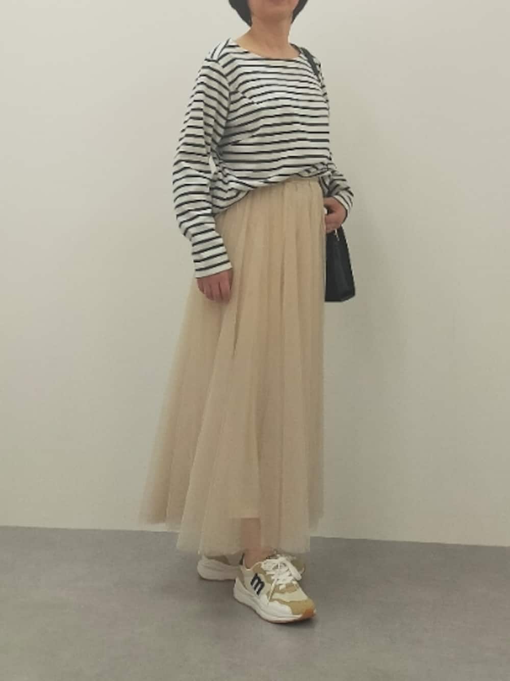 ~オトナカジュアルコーデのご提案です~ 【サイズ感】 Tシャツ:大きい胸専用サイズなのでバスト部分にゆとりがあり楽に着用できました。 スカート:Mサイズを着用したのですが、私の体型では少し大きめだったので、Sサイズの方が良かったかもしれません。 スニーカー:標準的です。 【コーディネート&おすすめポイント】 オトナ女子の春のカジュアルスカートスタイルを淡色でコーディネートしてみました。 透け感とボリューム感のあるスカートで春らしさを意識しました。 ボーダーTシャツにスカートを合わせることでカジュアル過ぎないスタイルを提案しました。