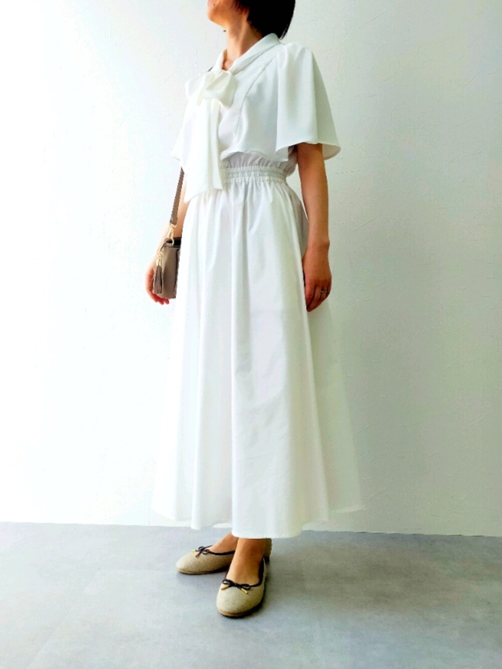 ~おでかけコーデのご提案です~ 【サイズ感】 普通のワンピースでは妊婦さんのようになってしまいがちですが、大きい胸専用サイズなのでバスト部分にゆとりがあります。私の体型ではFSサイズでピッタリでした。 私の身長では丈は長めで足首がきれいに見える丈でした。 【コーディネート&おすすめポイント】 上半身はゆったりと着られるのですが、ウエストシェイプしているのでメリハリがきれいなシルエットです。ウエストゴムなので、ウエストシェイプしていても苦しくないです。生地がさらさらで気持ち良かったです。足元はバレエシューズでナチュラルな雰囲気を意識してみました。バレエシューズはふわふわで履き心地やわらかでした。