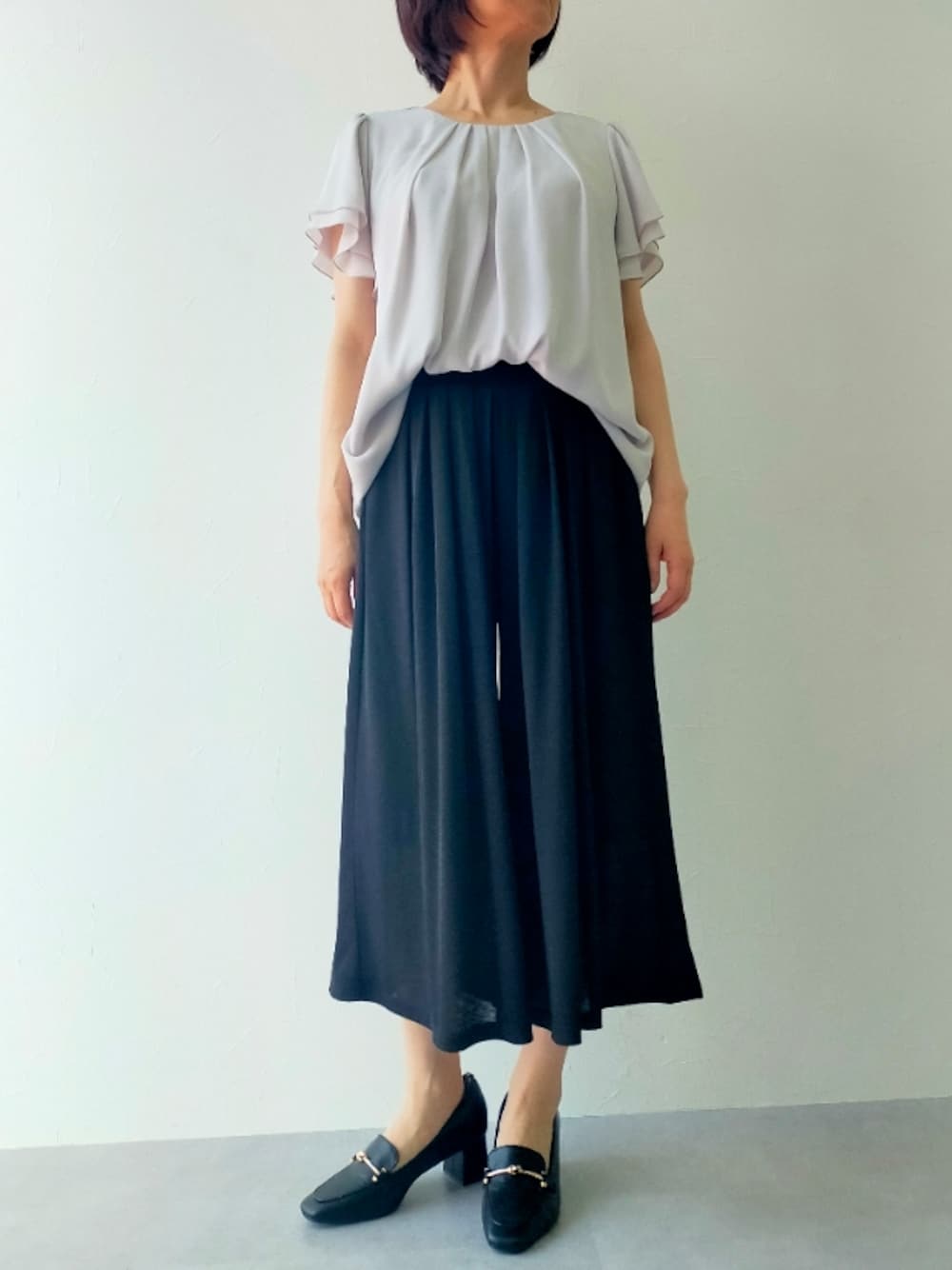 ~きれいめカジュアルコーデのご提案です~ 【サイズ感】 トップス:FMサイズを着用しました。大きい胸専用サイズでバスト部分にゆとりがありバストが強調されずすっきりしたデザインです。 パンツ:Mサイズを着用しました。私の体型では少しウエストが大きめだったので、Sサイズの方が良かったかもしれません。 【コーディネート&おすすめポイント】 ふんわりした透け感のあるジョーゼット素材の着やすいトップスです。裏地がついているので透けを気にせずに着用できます。パンツはゆったりしていて、素材感がさらっとしていてこれからの季節にぴったりです。女性らしいオトナなイメージを意識してコーディネートしました。
